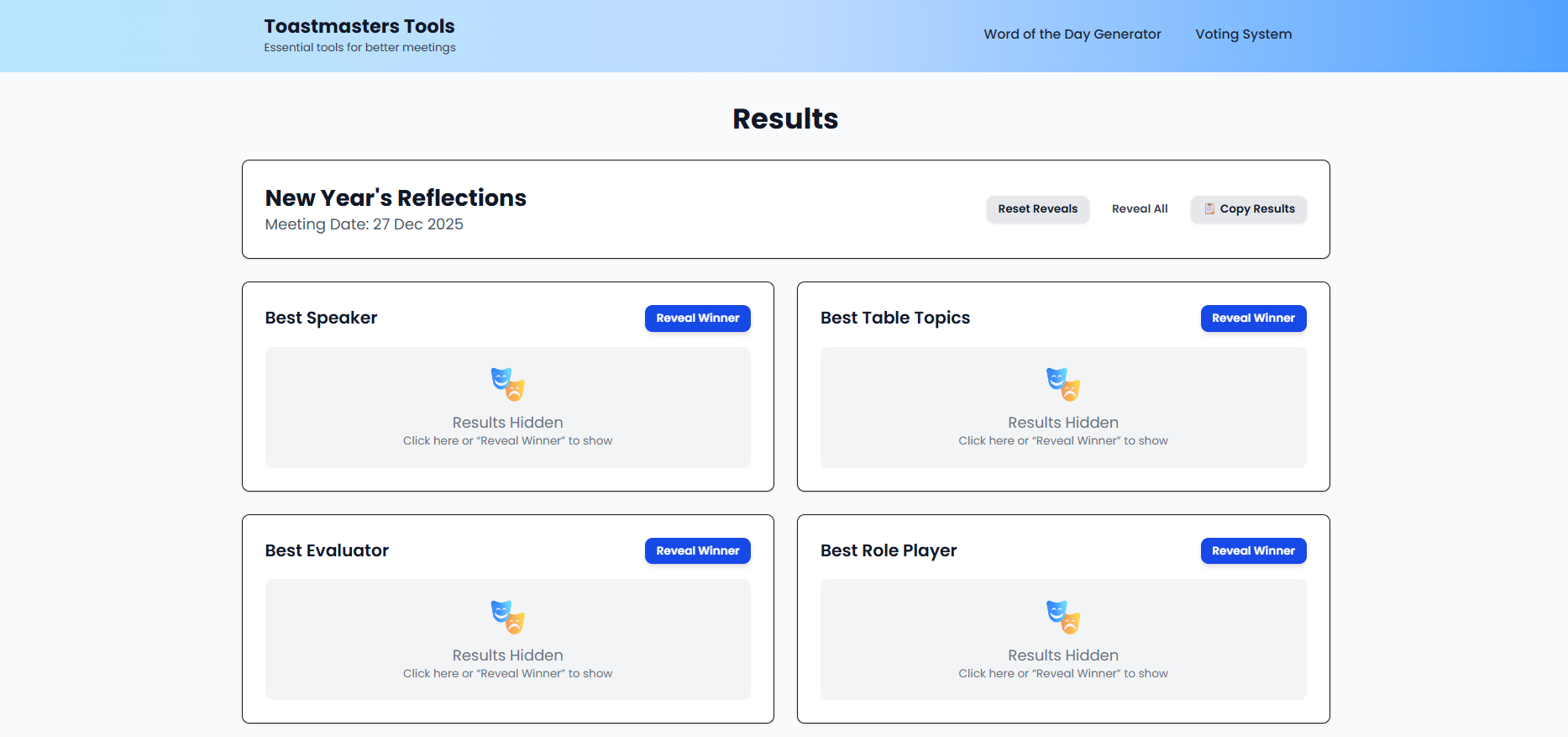 Digital voting platform for Toastmasters clubs to conduct evaluations and voting seamlessly during meetings.